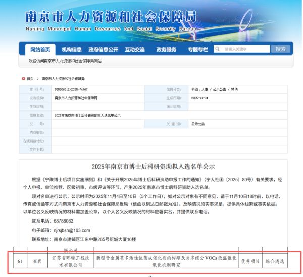 发布日期:2025-11-14 11:02 来源:省环境工程技术有限公司 字体:[ 大 中 小 ]近日,南京市人社局公布了2025年博士后科研资助名单,本年度共80位博士后获得科研资助。其中,卓越项目10项,优秀项目70项;21位为单位直荐,59为综合遴选。工程技术公司博士后创新实践基地崔岩博士后通过综合遴选,入选南京市博士后优秀项目资助。